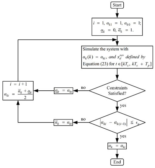 In this paper, a reference governor is investigated to ensure that actuator limitations are not violated by the system. If a violation of constraints is anticipated, the trajectory will be modified until all constraints are satisfied. The receding horizon principle and the bisectional search algorithm are used here to check for constraint violations, as shown in Figure 2. The command xd is subjected to a bisectional search until the optimal modification is determined. This is implemented through the optimization of parameter :