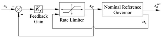 Despite the advantages of the nominal reference governor, the revised trajectory is discontinuous or even jitters if the trajectory xd changes rapidly [35]; therefore, when the discontinuous revised trajectory is applied to the closed-loop system, unmodeled high-frequency plant dynamics will be invoked, and the plant model used in the reference governor will not be accurate, which will decrease the plant behavior prediction accuracy. In this paper, a novel smooth reference governor is proposed to handle this problem, which can smooth the fast-changing trajectory by introducing a feedback mechanism based on the nominal reference governor; i.e., the nominal reference governor is augmented with a dynamic rate limiter, the threshold of which is closely related to . The feedback mechanism of the dynamic rate limiter is shown in Figure 3 and is given as: