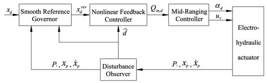 The block diagram of the proposed control structure is shown in Figure 4. As shown, the proposed smooth reference governor transforms the pressure xd to a revised reference signal . The nonlinear feedback controller treats as the command, and then a virtual flow command is generated. Finally, is divided into and by the mid-range controller, which drive the pump and valve, respectively.