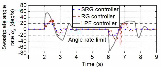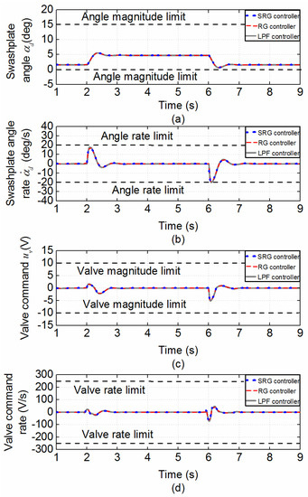 where uα is the swashplate angle, ωα and ξα represent the natural frequency and damping ratio of the system, and SM(∙) and SR(∙) are constraints on the magnitude and the rate. They are defined by: