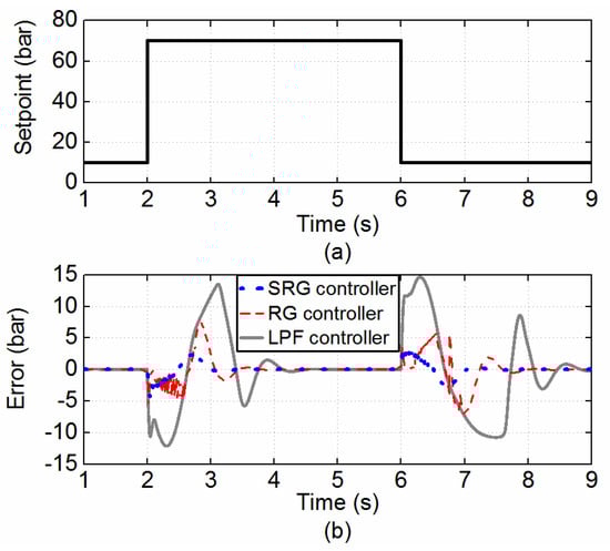 The selection of the control parameters of the proposed controller is based on the following rules: (1) control gains k1, k2 and c1 are chosen based on the saturation limits and bandwidth of the actuator; (2) filter parameters Tda and ξda depend on the saturation value of the valve displacement; and (3) decreasing the sampling time Ts and increasing the prediction time Tp can improve control performance, but more computing resources are required. According to the above rules and through trial and error, the control parameters of the proposed SRG controller were chosen for the simulation, as shown in Table 2.