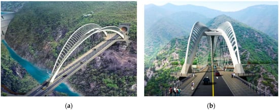 The construction of steel arch bridges in China started later than that abroad, but the number of constructions has gradually increased in recent years, especially in the emergence of special-shaped steel box rib arch bridges, which has enriched the structural layout form of special-shaped arch bridges and played an extremely significant role in the highway traffic system [,,]. Special-shaped arch bridges are widely used in cities because of their beautiful shapes and unique structural forms. The concept of using high-performance steel for arch ribs and main girders to increase the span of special-shaped arch bridges has greatly encouraged the engineering practice of building large-span special-shaped arch bridges in mountainous V-shaped canyons. At the same time, due to the application of high-performance steel in the arch bridge, the special-shaped thin-walled steel box arch bridge with its advantages of lightness and thinness overcomes the disadvantage of excessive self-weight of a traditional arch bridge and develops in the direction of large span with a strong sense of strength and beautiful curve shape []. Table 1 lists some of the completed steel box arch bridges with a span of 200 m or more at home and abroad [,,,,], but these steel box arch bridges have a comparatively conventional shape and low structural aesthetic appeal. The successful practice of the main span 450 m Ningbo Mingzhou Bridge has encouraged the breakthrough of special-shaped steel box arch bridges in terms of span, which has made special-shaped steel box rib arch bridges become a new development trend [,].