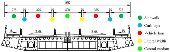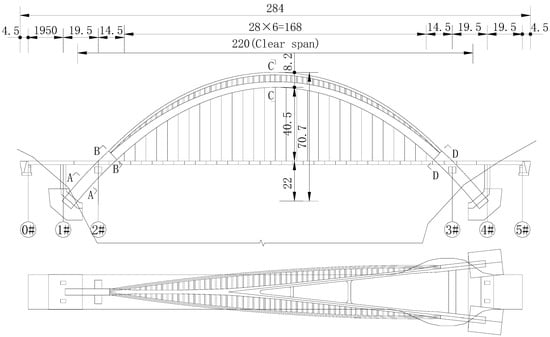 The main and secondary arch collaborative Y-shape thin-walled steel box arch bridge is mainly composed of main and secondary arch ribs, connecting ribs, suspenders, main girder, etc. The main components of the bridge are shown in Figure 2. The calculated span combination of the bridge is 2 × 19.5 m + 197 m (14.5 m + 28 × 6 m + 14.5 m) + 2 × 19.5 m, the main girder adopts double boxes and is a double-cell π-type steel box girder, the girder length is 274.7 m, the standard section width is 18.0 m, the main girder has a viewing platform at the intersection of double arches and main girder, the main girder width is 36.0 in the widened section and the girder height is 2.0 m []. The bridge layout is shown in Figure 3. The main arch adopts no hinge arch, the side and main span of the main girder use suspended continuous girder structure, and vertical bearings are set at the pier and crossbeam of the arch. The suspenders are flexible cables with a spacing of 6 m and a total of 29 pairs. Both ends of the suspenders are connected to the beam and the arch by steel anchor boxes, with tensioning at the arch end and anchoring at the beam end.