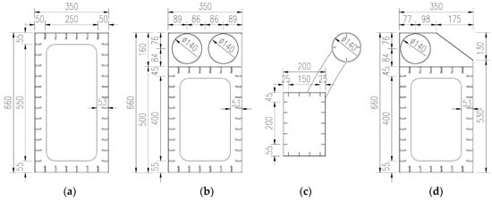 Characteristic sections of arch ribs (unit: cm): (a) Section A-A; (b) Section B-B; (c) Section C-C; (d) Section D-D.