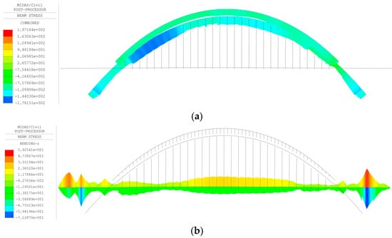 The design of the limit state of carrying capacity of the main components is calculated according to the basic combination of action effects. The load-carrying capacity limit state calculation is carried out in accordance with article 4.2.1 of the specification []. Under the basic combination of action effects, the maximum tensile stress of the arch rib is 197 Mpa, as obtained from Figure 9a; the maximum tensile stress appears in the connecting rib at the end of the main arch, and the control load condition is the combination of constant load + vehicle load + overall temperature fall + foundation settlement load. The maximum compressive stress is 178 Mpa, which occurs at the position of 1/4 arch rib on the single arch side, and the control load condition is the combination of constant load + vehicle load + overall temperature fall + foundation settlement load. The maximum shear stress is 46 Mpa, and its control condition is the combination of constant load + vehicle load + crowd load + foundation settlement + cross wind load. According to the strength design value of steel in Table 3.2.1 of specification [], the ultimate state stresses of steel structure carrying capacity are less than 320 Mpa and 185 Mpa, which meet the design requirements.