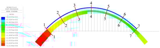 Figure 10 shows the axial force diagram of the arch rib under constant load. The axial force of the arch rib is compressed in the axial direction as a whole. The axial forces of the main arch rib and the secondary arch rib are symmetrically distributed in the cross-bridge direction, and the transition is uniform along the arch axis. The axial force of the main arch rib is slightly larger on the single arch rib side than on the double arch rib side in general, and the axial force of the main arch rib increases suddenly near the foot of the arch, which is due to the main girder load in this area. The axial force of the main arch rib at the foot of the single arch side is the largest, with a maximum value of 35,139.4 kN. The secondary arch ribs have the maximum axial force at the top of the arch and the minimum axial force at the foot of the arch, but the axial force on all sections does not vary much, ranging from −3183.11 kN to −3571.70 kN. The results of the axial force calculations for the seven sections in Figure 10 are listed in Table 7, from which it can be seen that at these seven positions, the main arch ribs share approximately 70−88% of the axial force, while the secondary arch ribs also share 12−30%. The secondary arch ribs share a smaller percentage of the load on the single arch rib side than on the double arch rib side, which is consistent with the results observed from the combined load action (Figure 9), which indicates that the load sharing ratio between the main arch rib and the secondary arch rib is independent of the load type. The secondary arch ribs bear a certain proportion of the load with a small cross-sectional area, which not only plays the role of structural carrying capacity, but also meets the aesthetic needs of the landscape, so the synergistic effect of the collaborative system of main arch ribs and secondary arch ribs is outstanding and reasonably designed.