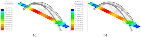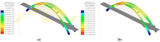 From Figure 11, it can be seen that the maximum vertical displacement of the arch rib under the vehicle load is 30 mm and the transverse displacement is 4 mm; the maximum vertical displacement under the crowd load is 20 mm and the transverse displacement is 16 mm, which meets the design requirements. Figure 11 shows that the maximum vertical deformation of the arch rib is not in the middle of the span, but near 3 L/8 and 5 L/8, and the deformation trend is similar to the “W” shape because the arch rib structure is spatially Y-shaped. Figure 12 shows that the maximum deflection of the main girder is 40 mm under vehicle load and 20 mm under crowd load, which meets the design requirements. The effect of both vehicle and crowd loads acting together is combined by the combination factor required by specification.