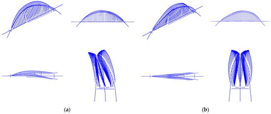 The secondary arch ribs are symmetrically arranged and inclined 5° outward around the line of their axes, which is a three-dimensional structure in space. The setting of secondary arch ribs improves the aesthetic characteristics of the structure. When the secondary arch ribs are removed, the distance between the top of the arch and the bridge deck is reduced and the arch becomes flat, which greatly weakens the structural aesthetics (see Figure 6). The arch axis is a suspended chain line, in which the net span is 184.5 m, the net height is 43 m, the height-to-span ratio is 1/4.29 and the arch axis coefficient is 1.756. The secondary arch is made of a circular steel tube section with 1.4 m diameter and 24 mm slab thickness. The stiffening ribs are slab ribs with a thickness of 12 mm, and the diaphragm is 12 mm thick. The axis of the main and secondary arch connecting ribs is a circular curve, varying step by step, with the section size of 0.7 m × 1.0 m and slab thickness of 20 mm.