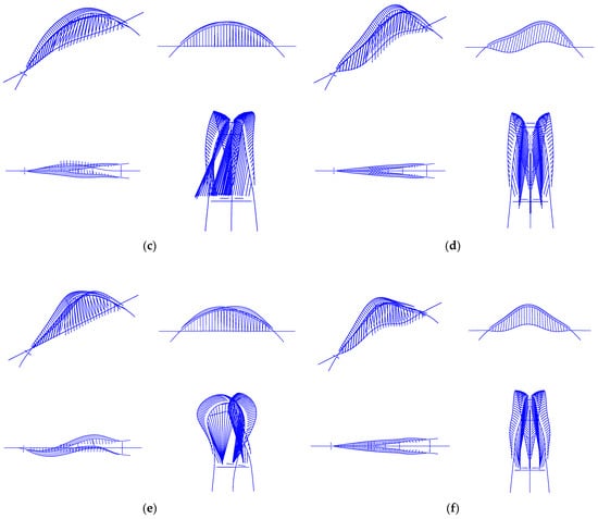 The first six orders of vibration mode characteristics of Y-shaped steel box arch bridge: (a) Mode 1; (b) Mode 2; (c) Mode 3; (d) Mode 4; (e) Mode 5; (f) Mode 6.