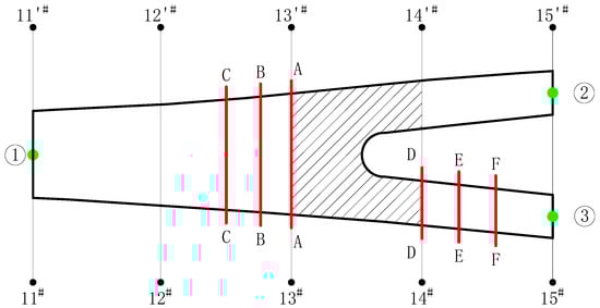 Although there are already formulas to consider the shear lag effect of a thin-walled concrete box girder, these formulas are not applicable to thin-walled steel box arch ribs due to the special characteristics of thin-walled steel box arch ribs, and thus the finite element method still has the advantage of a fast and accurate analysis of the shear lag effect. Six typical cross-sections in Figure 14 are selected to study the shear lag effect of thin-walled steel box arch ribs: cross-section A-A is the location of the suspender-anchored diaphragm on the side of the single arch rib, cross-section B-B is the location of the A-type diaphragm on the side of the single arch rib, cross-section C-C is the location of the B-type diaphragm on the side of the single arch rib, cross-section D-D is the location of the suspender-anchored diaphragm on the side of the double arch ribs, cross-section E-E is the location of the A-type diaphragm on the side of the double arch ribs, and cross-section F-F is the location of the B-type diaphragm on the side of the double arch ribs. Figure 15c,d respectively show the A-type diaphragm and B-type diaphragm. The a-type diaphragm is a hollow diaphragm on the complete section of the arch rib. The B-type diaphragm is not a complete one, but only half of the diaphragm.