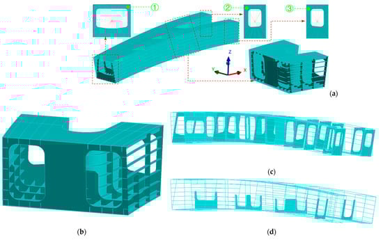 Spatial finite element model of bifurcation segment of main arch rib: (a) overall bifurcation segment; (b) Y-block; (c) A-type diaphragm; (d) B-type diaphragm.