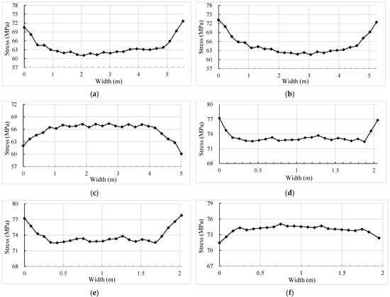 Stress distribution in the top slab of the main arch rib: (a) Section A-A; (b) Section B-B; (c) Section C-C; (d) Section D-D; (e) Section E-E; (f) Section F-F.