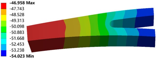 Figure 17 shows the vertical deformation of the local model. The vertical deformation trend is overall consistent with the global model established using the beam unit, but the vertical deformation on the same section appears to be unevenly distributed, and the section shows a regularity of larger displacement on both sides and smaller displacement in the middle, but this pattern is not obvious. The stress distribution on the bifurcated section of the whole arch rib is relatively uniform, and it is worth paying attention to the stress distribution state of the diaphragm in the anchorage area. Figure 18 shows the von Mises stresses in the diaphragm at the anchorage area under constant load in the 24 m local model, which is between 39 MPa and 77 MPa in most of the range, with only a local stress concentration at the location where the suspender is in contact with the diaphragm, with a maximum stress of 179.87 MPa. The arch rib bifurcation segment has the same distribution regularity under vehicle load or combined load. The von Mises stresses of the bifurcated segment model are analyzed under the five most significant design load combinations, which are (1) constant load + vehicle load + foundation settlement load, (2) constant load + vehicle load + overall temperature rise + foundation settlement load, (3) constant load + vehicle load + overall temperature fall + foundation settlement load, (4) constant load + vehicle load + crowd load + overall temperature rise + foundation settlement load and (5) constant load + vehicle load + crowd load + overall temperature fall + foundation settlement load.