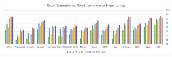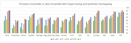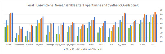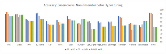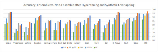 Figure 13, respectively. This section carried out a detailed comparison to highlight the imbalance and overlapping nature of multi-class classification by applying traditional and ensemble approaches followed by some statistical analysis. Here, we applied different ensemble classifiers (GB, RF, and DT) and non-ensemble approaches (KNN, linear, kernel SVM, and NB) on 15 multi-class datasets. Each dataset consists of a different number of samples, features, and classes, i.e., the instances vary in the range of 150–12,960, while the number of features ranges from 4 to 65 and the number of classes varies between 3 and 20. Our results consist of three parts; first, we explore the six different classifiers on 15 multi-class datasets with default parameters and without synthetic overlapping, using confusion matrix values to gain insight into the different performance measures such as