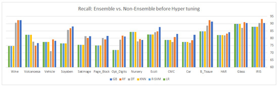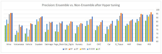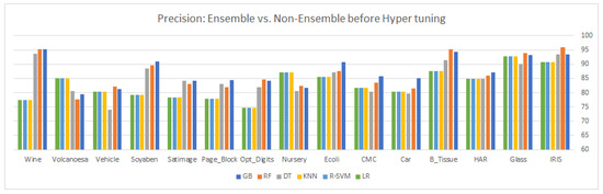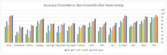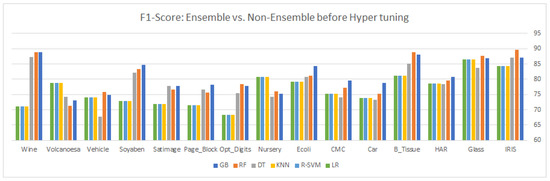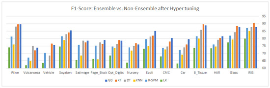 As a final comment about the comparison, if we divide the classifiers between the ensemble and non-ensemble classifiers, the ensemble classifiers outperform the non-ensemble classifier on almost all the datasets with conventional and hyper-tuned parameters. Among the ensemble classifier, there is no constant winner for all the datasets, but overall gradient boosting beats all the classifiers for both categories. In non-ensemble methods, R-SVM shows a remarkable performance with the rbf kernel for both the conventional and tuned parameters, as SVM selects a small subset of training data from the original training data to construct the model. During the hyper-tuning process, when we set the decision function value to “one-versus-rest”, it decomposes the multi-class problem into several binary class problems, making it convenient for the SVM to find an optimal hyperplane, thus improving its overall model performance.