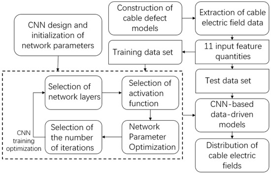 The process of building a data-driven model based on convolutional neural networks is shown in Figure 2. Firstly, the original data is collected on the distribution of electric field under different operating conditions of the cable, and 11 feature parameters affecting the cable operating condition are constructed to obtain the cable feature dataset. The feature data set is then divided into a training set and a test set, with 80% and 20% of the weight of each respectively. The optimized convolutional neural network algorithm was trained by using a small-batch stochastic gradient descent algorithm [23] on the training set to minimize the error between the predicted and actual outputs of the model, and the performance of the model was evaluated by the test set.