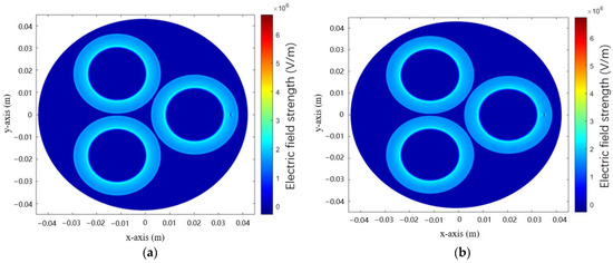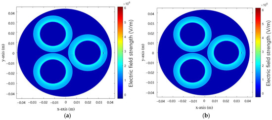 After applying the convolutional neural network method to learn the data set, a data-driven model of the cable with insulation impurities is created. In this case, the structural parameters of the cable model remain unchanged, and the voltage of the cable operation is changed. At this time, the cable operating voltage is 11 kV, the relative electric permittivity of impurities is 30, the conductivity is 18 S/m, the relative electric permittivity of insulation layer material is 1.5, the conductivity is 0.25 S/m, and the operating frequency is 50 Hz. The electric field intensity at each location of the cable was calculated using the data-driven model, and the electric field distribution clouds were plotted by MATLAB software and compared with those calculated and plotted by COMSOL Multiphysics with MATLAB software, and the results are shown in Figure 4 and Figure 5.
