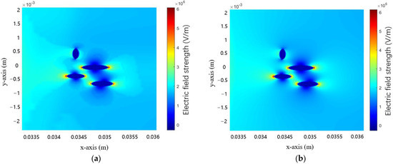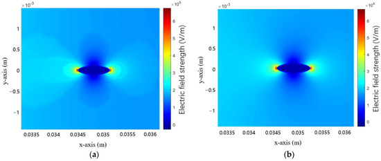 The results of the electric field strength calculated by the data-driven model obtained by the convolutional neural network-based algorithm are reliable. Therefore, the cable insulation under the above conditions can be analyzed based on the cloud diagram. From Figure 4, Figure 5, Figure 6 and Figure 7, it can be seen that the cloud diagram composed of the data obtained by learning and the cloud diagram composed of the actual finite element calculation have basically the same values at each position of the model, so the calculation results based on the convolutional neural network algorithm can be considered valid, and the electric field strength of impurities at the tip of the cable insulation in both cases is about 3 × 106 V/m, which is still less than the Breakdown field strength value, so the cable can still operate normally at this time.