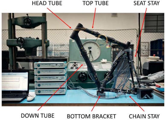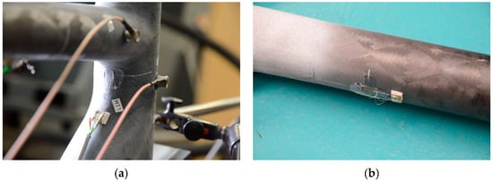 These can now be routinely tested in the laboratory. To identify the dynamic parameters of the structures, input–output methods are used [3]. Newer methods combine, for example, the wavelet-transformed representation of system responses with an independent component analysis [4,5]. The static, as well as fatigue tests, need to demonstrate that the bike’s structure has sufficient strength. This must be demonstrated from the stiffness point of view; for example, [6] describes the analysis of the frame stiffness response, and from the fatigue life point of view; for example, [7] describes the fatigue testing of the front carbon fork. The increasing demand to improve the performance of bicycle frames, especially from a safety point of view, necessitates an accurate description of the operational load of the frame. Due to the complexity and cost of such a task, which results from the requirement for small, lightweight and durable experimental equipment, operational measurements are performed only by some bicycle frame manufacturers. The origins of these operational experiments date back to 1968, when the first strain gauge (SG) analysis of pedal-and-crank strain was performed [8]. Today, even operational fatigue analyses are common, where the load operating spectra are measured by strain gauges calibrated to measure force, both for metal frames [9] and for composite frames [10]. However, due to the complexity and cost of operational measurements, bicycle manufacturers mainly focus on numerical simulations. These are created from basic models using beam elements to determine stiffness behavior [11], through the use of shell elements [12], to optimization tasks performed on the composite frame lay-up configuration [13]. The common solutions for laboratory and operational measurements use strain gauge analysis. In addition to bicycle frame testing, they are focused on testing other critical components such as handlebars, pedals and forks. However, experiments which commonly use the electrical strain gauge method for the stress–strain verification of the frame have some crucial disadvantages. A strain gauge cannot be embedded inside the composite lay-up or inside an adhesive joint. Therefore, only the surface strain can be measured. This could be insufficient in a case where a strain analysis of a geometrically complex shape is needed. A structural analysis of the specific layers of composite lay-ups or joints can be performed using Fiber Bragg Grating (FBG) sensor measurement technology, because FBGs are small enough to be placed between the particular filaments [14,15].