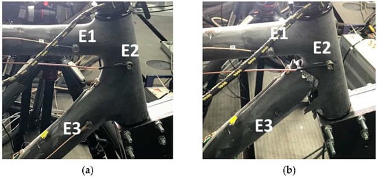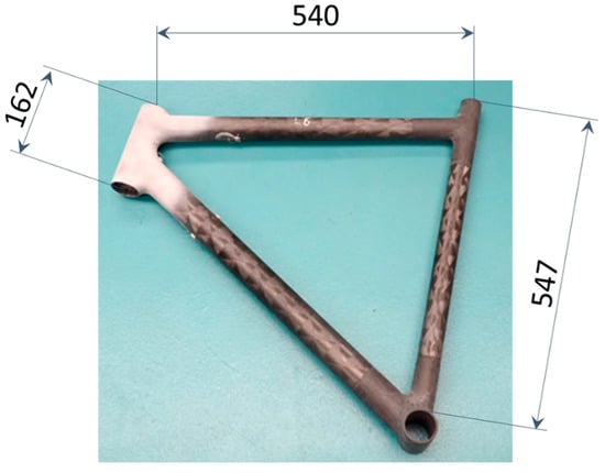 Bicycle frames made from carbon fiber reinforced polymers (CFRP, see Figure 1) are now widely commercially available. Besides prepreg molding technology, composite wound tube technology is the most common method for the manufacture of bicycle frames. In general, the most problematic points of a bicycle frame, which consists of wound structural tubes, are the joints of these structural tubes. One common method of joining the tubes, by using glued sleeve joints, has both performance and visual limitations. These are caused by the technology of the composite manufacturing itself [1], which differs from the traditional manufacturing technology for steel or alloy frames, especially with regard to the service life of the adhesive joints of composite tubes [2]. Therefore, research has focused on joint improvement, by trying to improve the strength of the hand lay-up laminated joints. Structural stress–strain analysis is an integral part of such research and experimental verification is necessary. In order to achieve the optimal design of a bicycle frame, as well as other components such as forks, handlebars, etc., it is essential to have the best possible knowledge of the static and dynamic properties of the frame and other individual components.