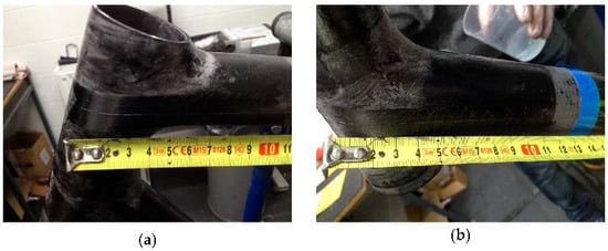 The maximum strain value from the steady part of the strain-time record (operational maximum deformation) on the surface of the frame tubes in the DTF34 and TTF34 locations (see Figure 4a) was evaluated from the strain gauge’s signals. These values expand the information about the head tube joint area’s mechanical behavior, providing a comparison of the local mechanical strain inside the joint with the mechanical strain measured in its vicinity, on the surface of the tube by the strain gauge. Strain values can be found in Table 2 (marked as SG DTF34 and SG TTF34).