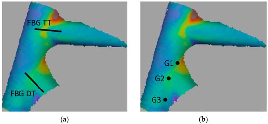 (a) Position and marking of surface-mounted strain gauges; (b) Location of FBG sensors (blue marking).