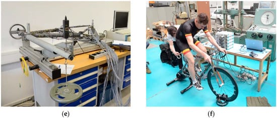Figure 8. Bicycle frame (specimen 0) loading procedures: (a) Pedal forces; (b) Horizontal forces; (c) Vertical forces; (d) Bottom bracket stiffness; (e) Head tube torsion stiffness; (f) Ergometer test. - Horizontal forces (frame is attached through the rear dropouts, with a front/back horizontal load through the fork, F = 600 N, load control mode, frequency of cyclic loading f = 2.5 Hz, 1000 cycles, see Figure 8b);