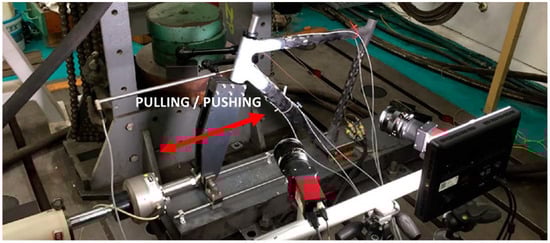 - Pedal forces (frame is attached through the rear dropouts and loaded by vertical force F = 1100 N through the right crank, load control mode, frequency of cyclic loading f = 2.5 Hz, 1000 cycles, Figure 8a);