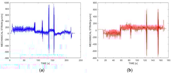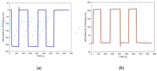 Time series of mechanical strain values indicated by FBG sensors during the ergometer test (frame specimen 0): (a) FBG DT; (b) FBG TT.