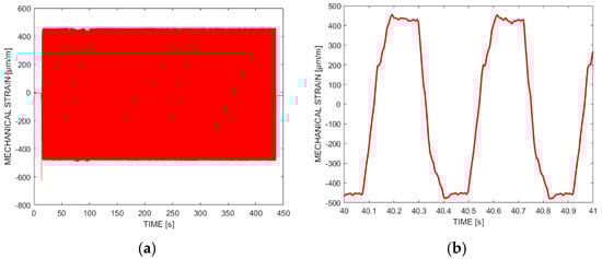 Time series of mechanical strain values indicated by FBG sensors during the pedal forces test (frame specimen 0): (a) FBG DT, complete test run; (b) FBG DT, detail of a load cycle.