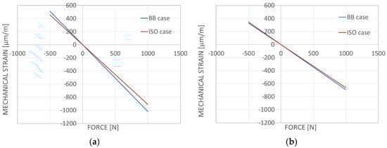 In the first step, the influence of frame simplification from frame specimen 0 to a simple triangle in the case of frame specimens 1, 2, 4, 5, 6 and 7 was evaluated. The question was whether the standard ISO case (specimen 0), where the frame is attached to the ground using rear dropouts, was equivalent to the simplified case, where the frame is attached using the bottom bracket tube (BB case, specimens 1, 2, 4, 5, 6 and 7). For both cases, the loading using the equivalent test fork was identical. Strain gauges were installed on all the tested frames near the head tube (DTF1, 2 and TTF1, 2 in Figure 4). These strain gauges were placed on the top and bottom surfaces of the tubes and connected using the quarter-bridge measurement scheme, from which the bending strain component was calculated. The dependence of the measured mechanical strain on the loading force of the fork is plotted in Figure 14a for the DTF location and in Figure 14b for the TTF location. A linear flexibility response of the frame was found, with values of −0.91 μm/m/N compared to −1.02 μm/m/N (12% increase) at the DTF location. At the TTF location, values of −0.66 μm/m/N and −0.69 μm/m/N were found (an increase of 4.8%). This corresponds to the supposedly increased portion of load transfer by the simplified frame triangle, while the DT transfers a bigger part of the load. The simplification of the load case scenario from the mounting by using the rear dropouts to the mounting, which is using the bottom bracket, is viable. The upper and lower frame tubes are strained slightly more; however this is still on the safe side.