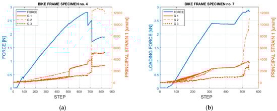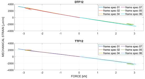 As mentioned in the above text, bicycle frame specimens 1, 2, 4, 5, 6 and 7 were tested until their final failure; specimens 1, 2, 4 and 7 were loaded by a pushing load, while specimens 5 and 6 were loaded by a pulling load. The experimental configuration is shown in Figure 9. The maximum force at failure was indicated when the first peak maximum was reached. A range of forces from −3.3 kN to 3.1 kN was found. Load curves for both pushing and pulling cases are shown in Figure 15. A linear dependence in the response of the strain gauge installed on the TT and the DT frame tubes near the head tube (DTF12 and TTF12, see Figure 4a) can be seen over the entire range, from zero force to the maximal indicated force.