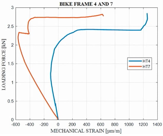 During the structural strength test of the frame, attention was also focused on evaluating the effect of reinforcing the composite lay-up of the head tube joint by adding both unidirectional carbon filament layers and carbon fabric layers. For this purpose, strain gauges were installed on the rear side of the head tube (location HT, see Figure 5a). This location was chosen because there is the same composite lay-up for all frame specimen designs. The mechanical strain measured by the strain gauge at the HT location on the head tube, depending on the loading force, is plotted in Figure 16 for specimen 4 with the original composite lay-up and for specimen 7 with the reinforced composite lay-up. In the case of frame specimen 7, there was a delay in the loading process at about 2.3 kN due to technical reasons. We can see that the load characteristic indicated by the HT4 strain gauge on frame specimen 4 is linear up to a load of approximately 1 kN, with Fmax reaching 2.85 kN. In the case of frame specimen 7, the load characteristic indicated by the HT7 strain gauge shows a linear response up to approximately 1.3 kN, while the Fmax of 2.82 kN was reached. According to the strain gauge at the HT location, frame specimen 7 behaves better than frame specimen 4 in terms of the operational properties of the bike. The loss of linear response occurs at about 35% of the limit load in the case of specimen 4, while in the case of specimen 7, this occurs later, at about 46% of the limit load due to the reinforcement of the head tube joint area.