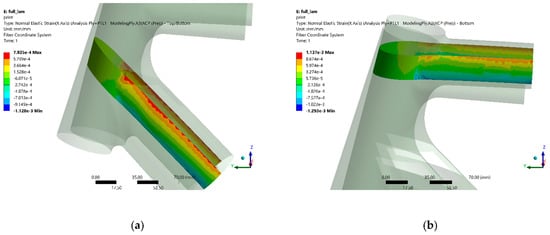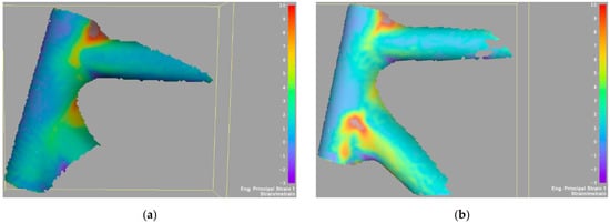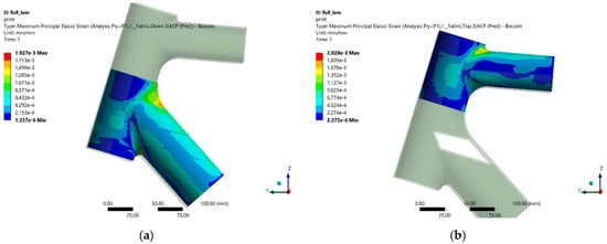 The maximum principal elastic strain evaluated on the surface of the head tube joint is shown in Figure 27a for the DT to HT connection and in Figure 27b for the TT to HT connection area. From the comparison with Figure 17, it can be seen that the character of the principal strain 1 distribution on the surface of the joint area is similar, with the compressive deformation of the bottom of the DT and the tensile deformation of the top of the DT. Likewise, in the case of the TT, the top of the tube is stretched and the bottom of the tube is compressed. However, from the result of the FEA performed on the UD tape, it is obvious that the tape is loaded by bending on the surface of the joint. When viewed from the side, the tensile strain can be seen; however, the strain distribution is very uneven. Thus, as in the case of an embedded FBG sensor, when the measured strain depends on the position of the FBG sensor inside the UD tape, the strain gauge measurement on the joint surface would also be difficult due to the result of the measured strain, which is highly dependent on the strain gauge position, size and orientation to the composite layer axes. In addition, the characteristic of the layered composite is applied in the joint with a 3D complex geometry, where in addition to the magnitude of the deformation, the direction of the indicated strain also differs in the individual layers of the lay-up. This makes classical strain analysis difficult. In the case of the FBG sensors, which were embedded into the only place where it was technologically possible, i.e., between the layers of the UD tape and its neutral axis, the sensitivity to the position of the sensor is large. However, a relative comparison of individual load cases is possible.