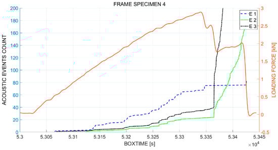 Bicycle frames were equipped with three Dakel IDK-09 piezoelectric sensors, marked E1 (TT location), E2 (HT location) and E3 (DT location), which were attached to the tubes by means of cyanoacrylate adhesive. These sensors were connected to the Dakel Rpety XEDO-AE21 measurement device. The location of the sensors on the frame specimen is shown in Figure 7. A more detailed description of the method is provided in Appendix A.4. The properties of both the acoustic emission sensor and the measurement device are shown in Table A3 in Appendix A.4.