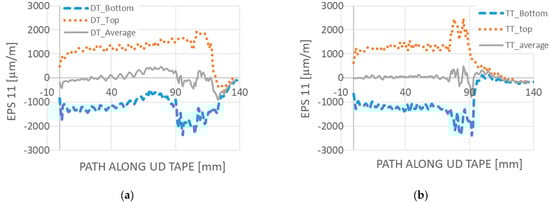 Strain distribution along the edges of UD tape in HT lamination: (a) Tape in DT; (b) Tape in TT.