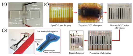 (a) An EGaIn strain sensor, (b) a carbon black/elastomer composite flexible sensor, and (c) the fabrication process of a mask-sprayed flexible sensor.