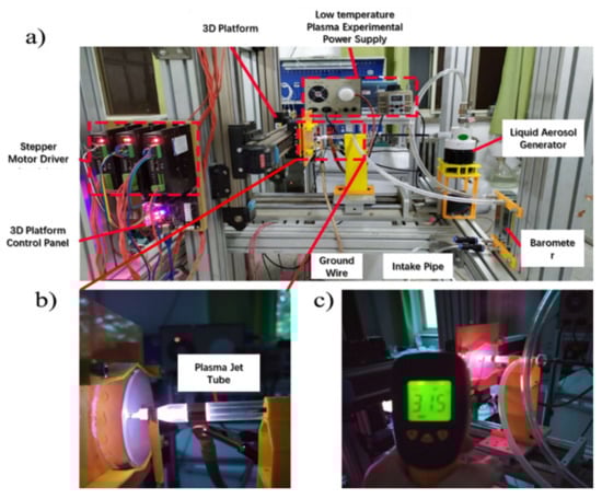 There are three main types of plasma jet generators: single-electrode, double-electrode, and three-electrode structures [,,]. Because the spray material contains non-working gas components, a dual-medium jet device with coaxial dual jet channels is required. The inner channel sprays the material, and the outer channel generates plasma. Therefore, in this study, a dual-medium jet plasma tube was designed (Figure 2b). The plasma jet took the form of a ring-to-ring discharge. The device consisted of an inner-layer quartz glass tube, an outer-layer quartz glass tube, a collector, a main air inlet, and an auxiliary air inlet arranged on the jet tube. To enable full contact between the spraying material and the plasma after being ejected from the nozzle, the outer nozzle was extended 2 mm compared to the inner nozzle. Figure 2c indicates that the temperature of the low-temperature-plasma spraying was 31.5 °C.