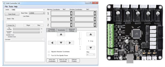 The control board of the 3D platform was connected to a computer to achieve motion control. The setup was mainly composed of control software, a control board, a driver, a linear slide table, and a DC switching power supply (48 V). The control program was generated by the 3D design and processing software (UG). The Grbl Controller open-source control software was adopted here. The MEGA2560 control board, which is commonly used in 3D printers, was selected for the 3D computer numerical control milling machine control software. Figure 3 shows the 3D platform control interface and the 3D platform control panel. The step speed of the stepping motor we used was 1000 r/min, the speed of the synchronous belt was 0.1~1 mm/s, and the repeatability was 0.05 mm. The movement of the moving part was achieved by using a CCM synchronous belt linear slide table.