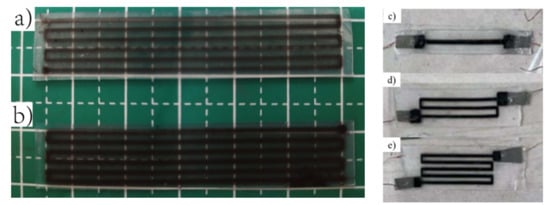 Flexible sensors with different patterns were fabricated using the proposed controllable plasma spraying method for conductive nanoparticles (Figure 6). For comparison, flexible sensors were also fabricated using a spraying method without the plasma treatment. The air pressure during the spraying process was 3 L/min, the amplitude of the plasma power supply voltage was 8.20 V, and the frequency was 89.7 kHz.