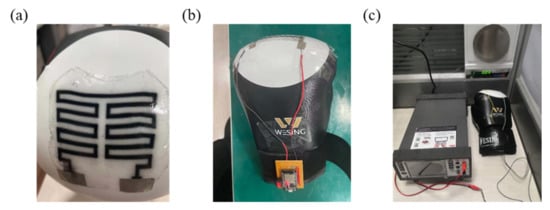 The prepared flexible strain sensor was closely attached to the surface of the boxing glove. To improve the sensitivity of the sensor and the accuracy of the boxing-force measurement, the path of the sensor was evenly distributed on the fist surface of the boxing glove. Figure 7a shows the optimized glove using multiple folded paths. The data-measurement circuit was mainly composed of an ESP32 development board, a lithium battery, a voltage divider, a flexible sensor, and copper wires. The circuit was fixed on the boxing glove with velcro tape. Figure 7b shows the prototype of the developed portable smart glove.