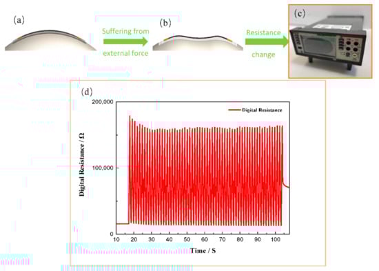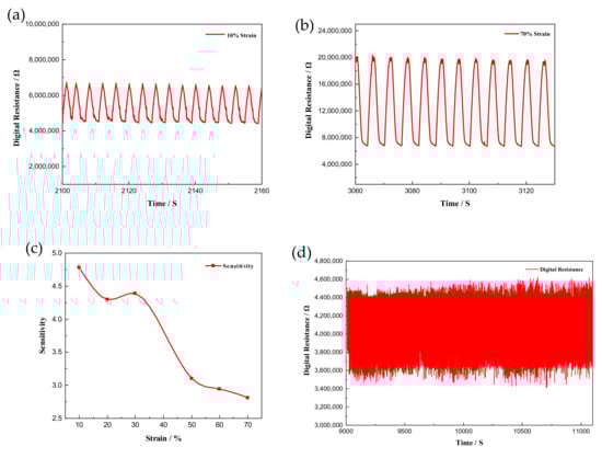Figure 13a,b show the response characteristics of the samples during cyclic stretching under 10% strain and 70% strain, respectively. Under 10% strain, the number of cycles reached 2500 (Figure 11c), whereas under 70% strain, it reached 2000 cycles (Figure 13d). These results showed that the flexible sensor had excellent cycle stability.