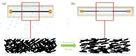 Microscopic mechanism of the developed flexible resistive sensor: (a) before applying the force; (b) after applying the force.
