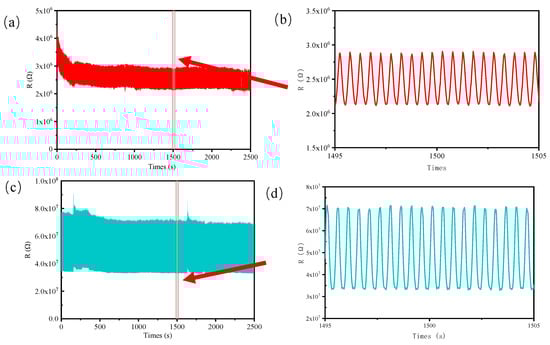 Responses of the untreated sensors and the sensors treated with low-temperature plasma to strain: (a) the change in the resistance of the untreated flexible sensor stretched 2500 times at 10% strain; (b) an enlarged view of the change in the resistance of the untreated flexible sensor; (c) the change in the resistance of the flexible sensor after plasma treatment under 10% strain after stretching 2500 times; (d) an enlarged view of the change in the resistance of the flexible sensor after plasma treatment.