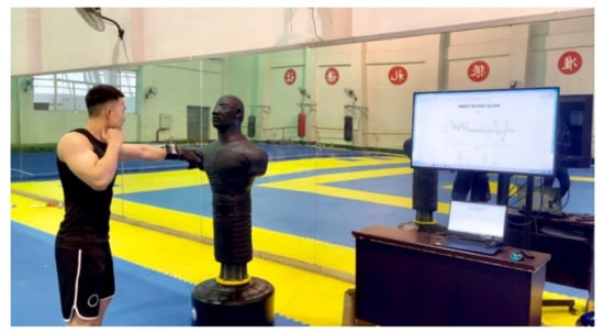 The ESP32 development board was set to AP mode. The maximum transmission speed of the board was 150 M/S; however, in the AP mode, the maximum transmission speed was 2 MB/s. The analog-to-digital conversion converted the actual voltage into a digital quantity within 0–4096. Each datum occupied 2 B, so theoretically, 1,000,000 digital data could be read in one second. However, actual testing indicated that one datum per second could form a very smooth curve between the striking force and time, which also improved the data preservation. To test the performance and portability of the portable smart glove, a professional boxing coach was asked to test the prototype in the boxing gym of Hunan University of Arts and Sciences. The results of the on-site test are shown in Figure 14.
