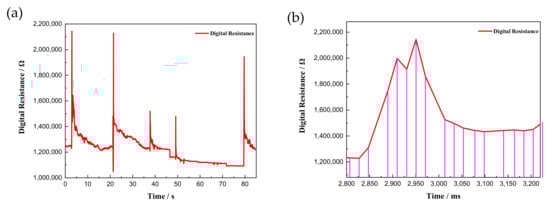 Figure 11a,c indicate that the presence or absence of plasma treatment had a significant impact on the electrical properties of the sensing layer. Two resistance-strain sensors (a plasma-treated one and an untreated one) of the same size were stretched several times. The plasma-treated flexible resistance-strain sensor exhibited a relatively stable change in the tensile resistance. The tensile and recovery resistance of the untreated flexible resistive-strain sensor rapidly decreased within the first 300 reciprocating stretches, and the decrease ranged from large to small. After this, the resistance changes stabilized. This indicates that the low-temperature-plasma treatment enhanced the stability of the flexible resistive-strain sensor.