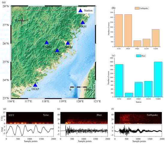 Fujian Province has a large number of historical and modern earthquakes due to its proximity to the Taiwan subduction zone. There are four NE trending fault zones nearly parallel to the coastline and several NW trending faults almost perpendicular to the coastline. The continuous activity of these faults leads to frequent natural earthquakes in this area []. In addition, because Fujian is adjacent to the Taiwan Strait, it is a research area attracting many scholars to study the crust and upper mantle structure on both sides of the Taiwan Strait and adjacent areas by artificial blasting []. These blast data have caused great interference for the Fujian seismological network to accurately identify natural earthquake events. These abundant blasting data in this area provide a solid data basis for our work in this paper. The earthquakes and blast data recorded by XYSC, DSXP, FDQY, FZCM, and YXBM stations of the Fujian earthquake monitoring network from 2012 to 2019 were selected as the research object, as shown in Figure 1 and Table 1. These stations all use broadband recorders, which can save the frequency information of different earthquake types well.