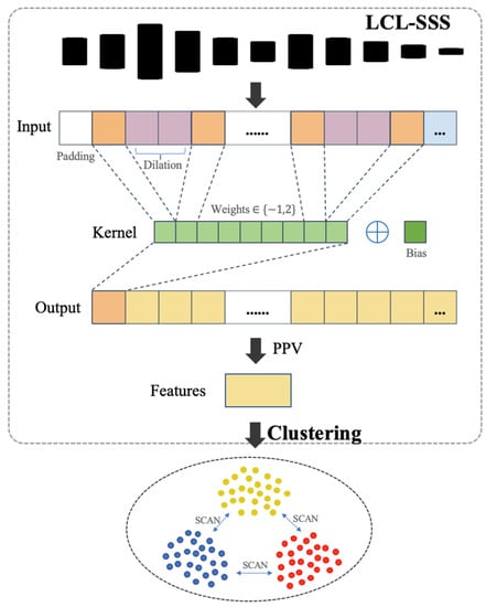 Supervised learning is a method that uses an algorithm to map input feature vectors to output label vectors. These algorithms use known training samples (pairs; the number of samples) to optimize the model. Seismic waves are precisely a set of time series data arranged in chronological order, so they can be treated in this way. Convolution is a powerful tool for feature extraction in data mining. Since the establishment of AlexNet, the champion model of ILSVRC challenge in 2012, convolutional networks have developed rapidly. There are AlexNet [], VGG [], Inception [], and ResNet []. The above network models all have a multilayer network structure. Although they have a good classification effect, the computational efficiency decreases with the deepening of the network. In addition, these models can only be used for supervised learning tasks, not large unlabeled datasets. The random convolution kernel transformation Rocket, however, uses a large number of random convolution kernels combined with linear classifiers (ridge regression or logistic regression). This method confirms that for relatively simple time series classification, better classification performance can be achieved without the establishment of a deep neural network []. Rocket is divided into two parts: the feature extraction part and the linear classification part. From the resulting feature map, Rocket returns the maximum value and a new feature, the proportion of positive values (PPV). Yet, MiniRocket is an improved method based on the Rocket method [], with further improvements in computational efficiency [].