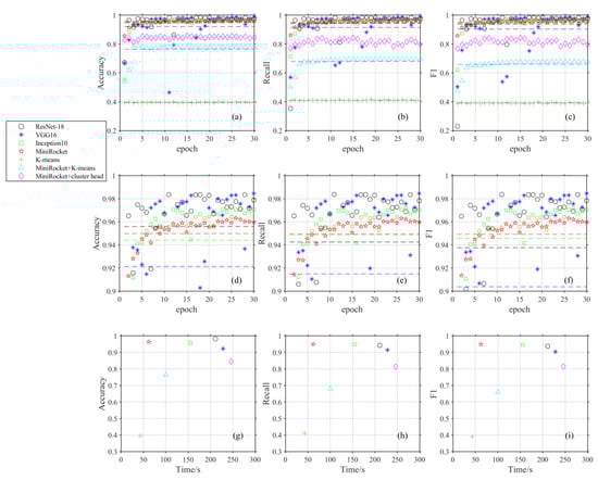 Epoch calculation accuracy, recall, and F1 values with calculation time of 30 times with all classification methods. (a–c) Comparative accuracy, recall, and F1 values for different models in each epoch; the dotted line indicates the average value. (d–f) The enlarged images of (a–c), respectively, show only the exponential distribution in the range of 0.9–1 in order to clearly see the indexes of various methods. (g–i) Comparison of the calculation efficiency and the mean accuracy, recall, and F1 values of different models.