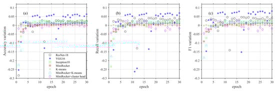 Deviation of each index of each iteration from the median value.(a–c) represent the accuracy, recall, and F1 values for different models in each epoch.